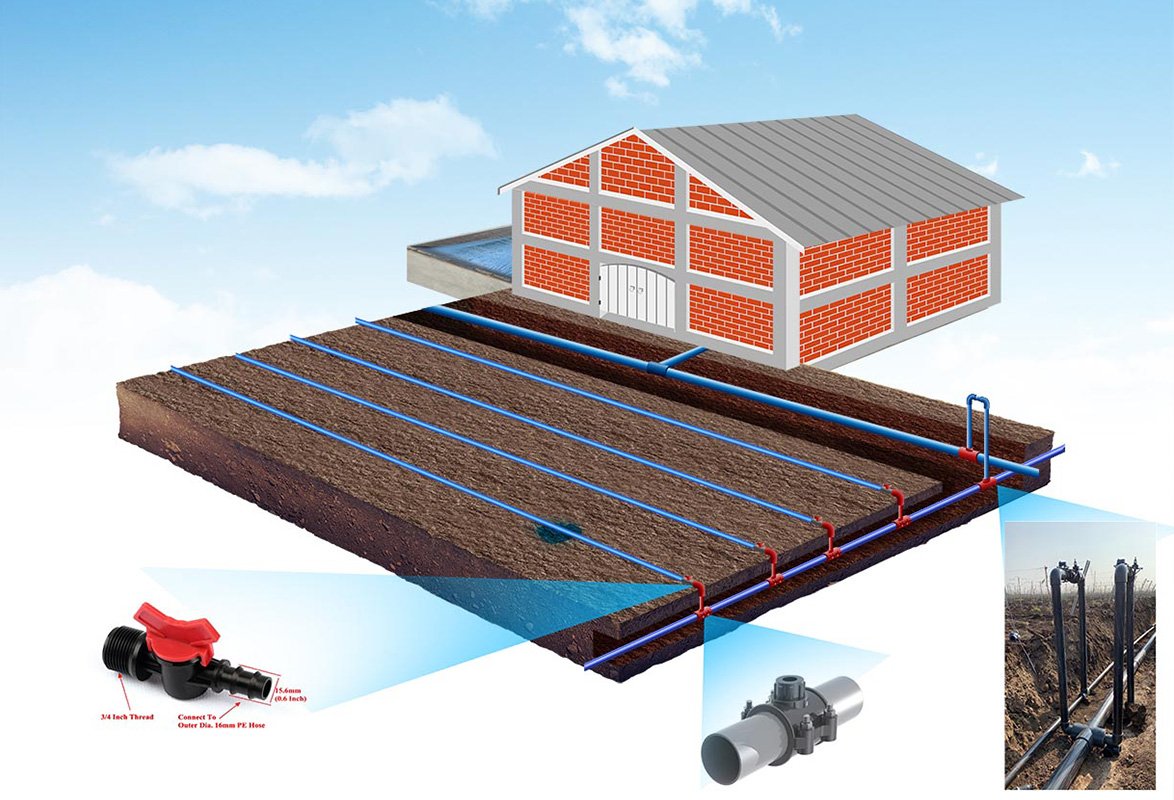 Yapılan işaretlemelere göre sulama sisteminin yeraltı boruları için kanallar açılır ve ana borular serilerek tüm valf grupları ile birlikte montajı yapılır. Daha sonra açılan kanallar kapatılarak toprak yüzeyi dikime hazır hale getirilir.