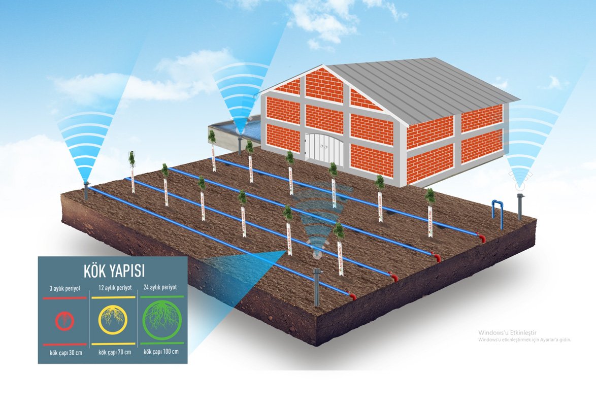 Dikimi tamamlanan sıraların toprak üstü lateral damlama boruları serilir ve hemen sulamaya başlanarak can suyu verilir. Can suyundan sonra sahadaki nem sensörlerinden ana kumanda merkezine gelen veriler bir program sayesinde otomatik olarak değerlendirilir ve otomasyon sistemi devreye girerek su ihtiyacı olan parsellerde sulama işlemi başlar.
